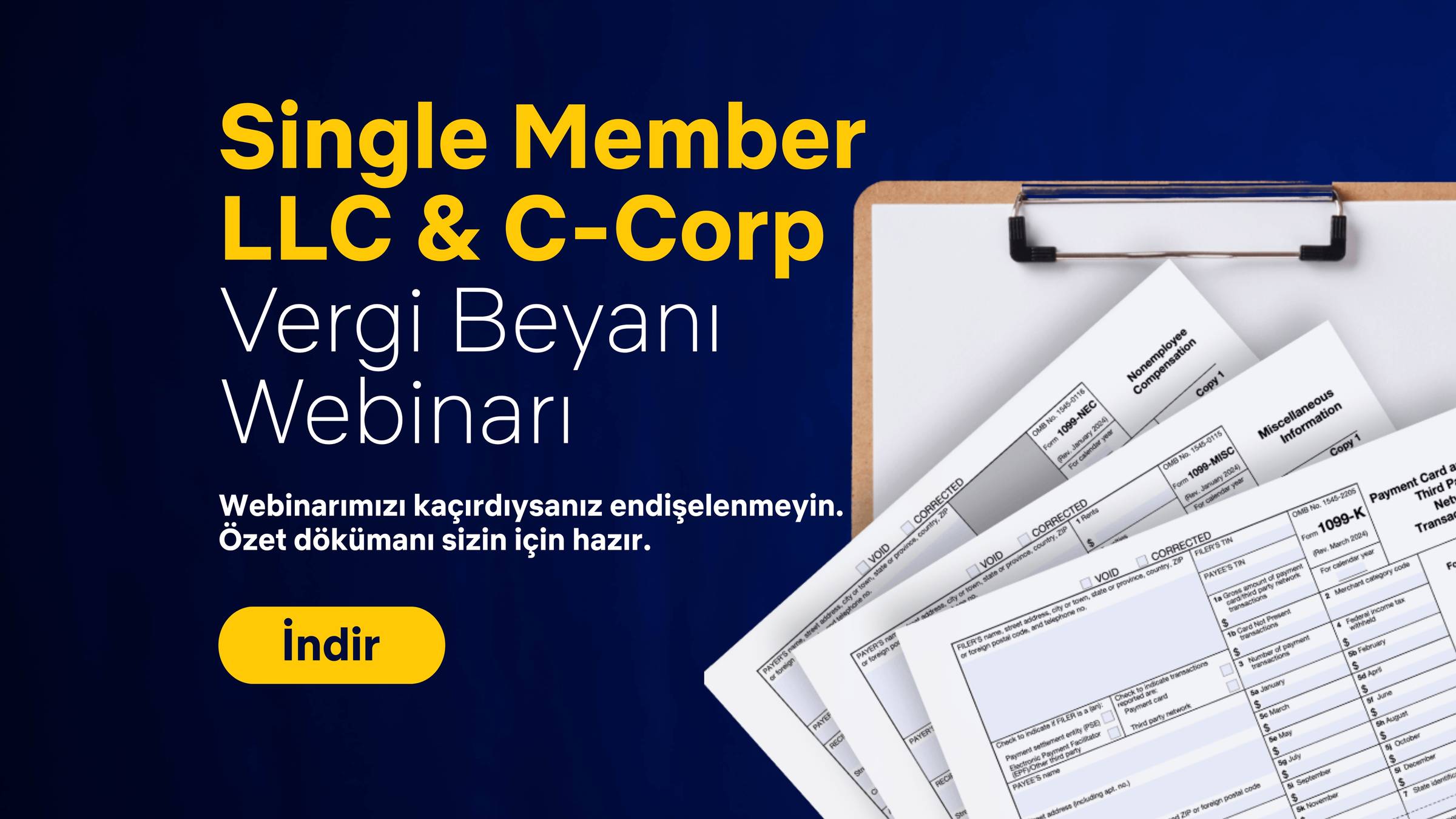 Single Member LLC, C-Corporation ve Individual vergi beyannameleri için son tarih olan 15 Nisan'a çok az kaldı! Bu tarihin kaçırılması durumunda gecikme cezaları ve faiz yükümlülükleriyle karşılaşabilirsiniz. Vergi beyan sürecinizi başlatmak için hemen bizimle iletişime geçin. Görüşme Oluştur Whatsapp Duyuru Kanalı Abone Ol Unsubscribe · Preferences